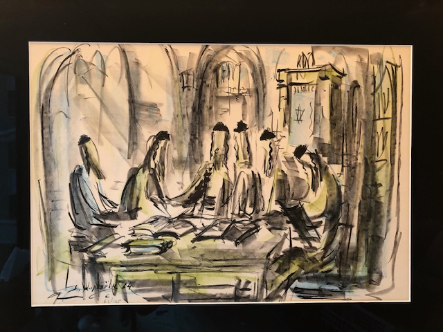 There’s a painting in our office in the new apartment we are still finishing in the high rise building near the mall in the city where we rented our first apartment when we came here what now feels like a long time ago and it was. It is a gaggle of men studying. I started to say a group of Rabbis but why do I assume only Rabbis study. I guess you could ask why only men but that’s a different discussion. They sit pretty close to each other, breathing disagreements and questions on each other’s faces. Things we notice now.