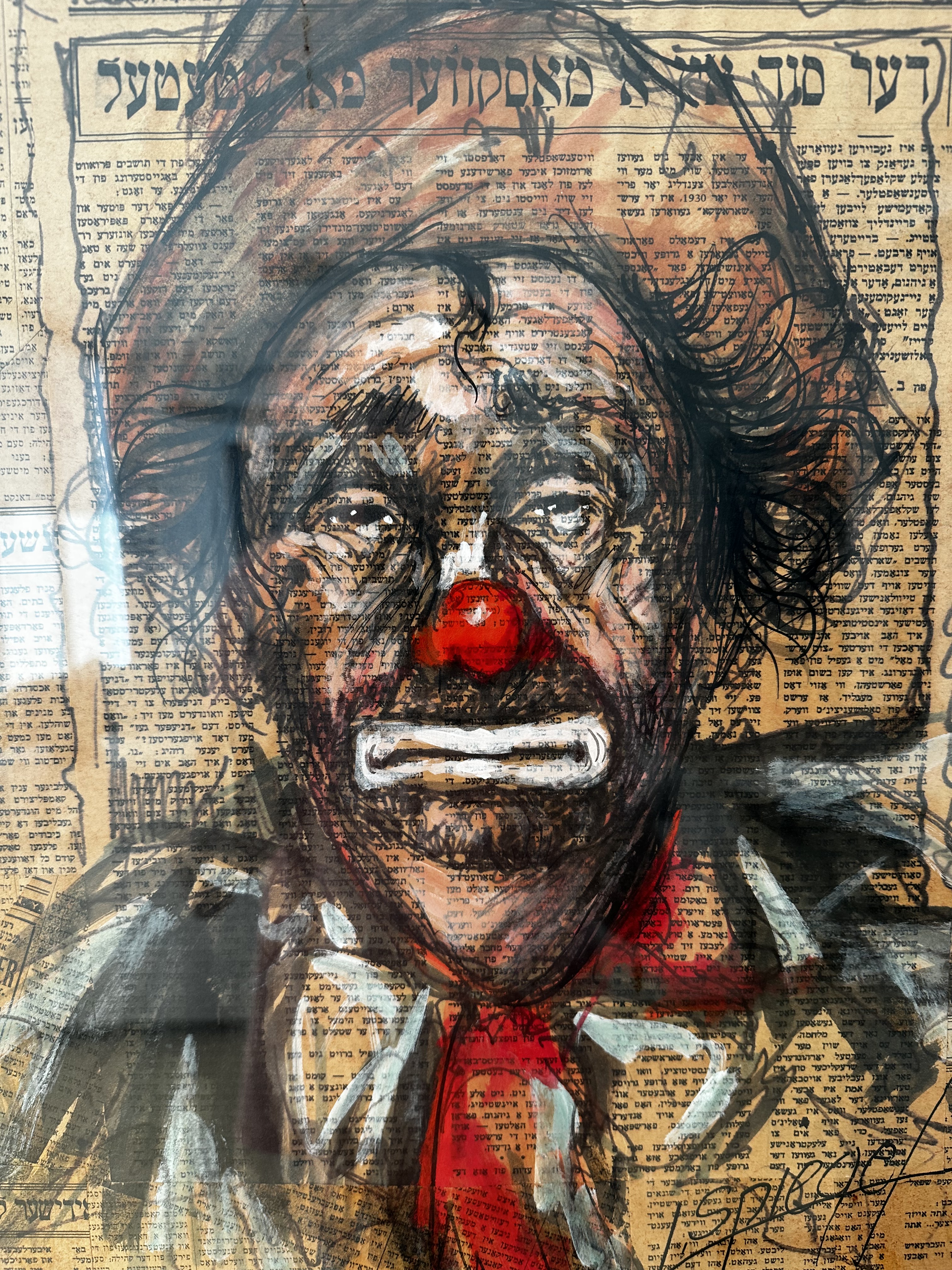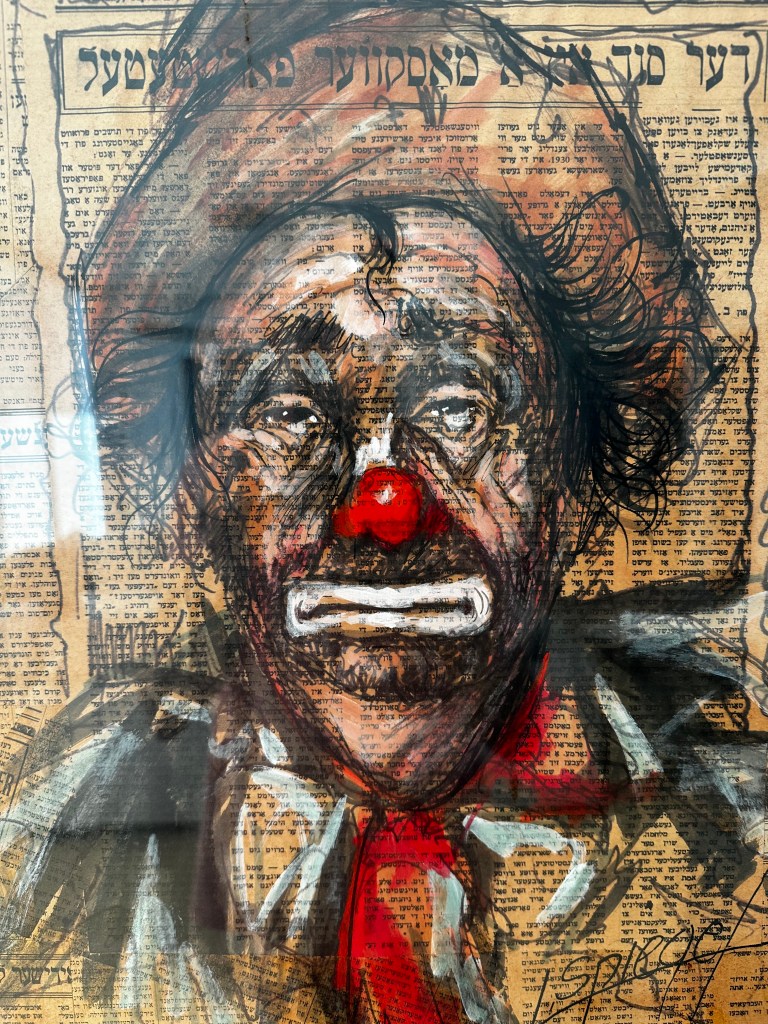 PS – the image of the clown at the top of this blog is painted on what was then called “The Forvetz” – from when The Forward was still printing in Yiddish. Eileen and I have a pair of them – one where the clown is “happy” and this one. I’ll let you decide what all that means.